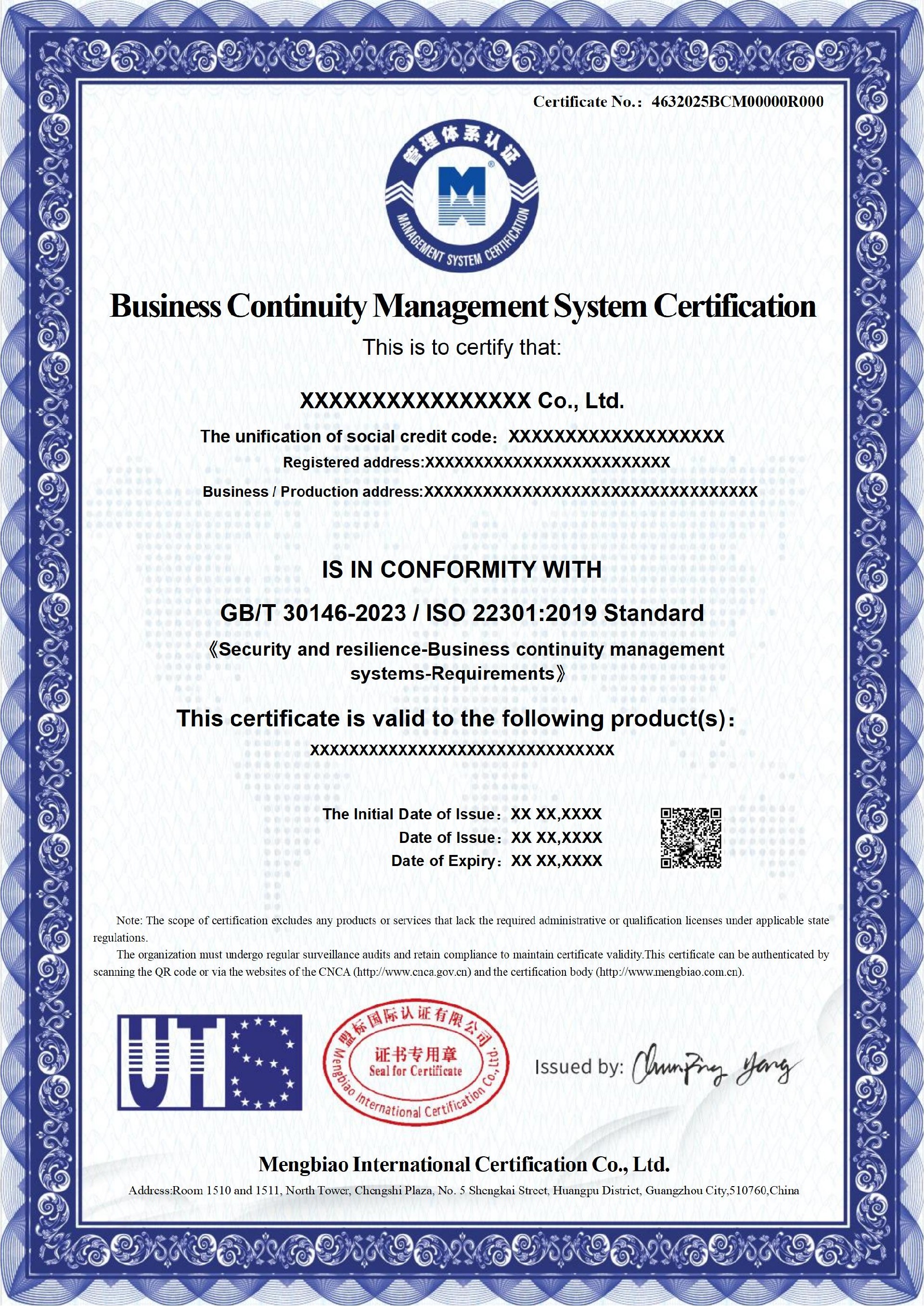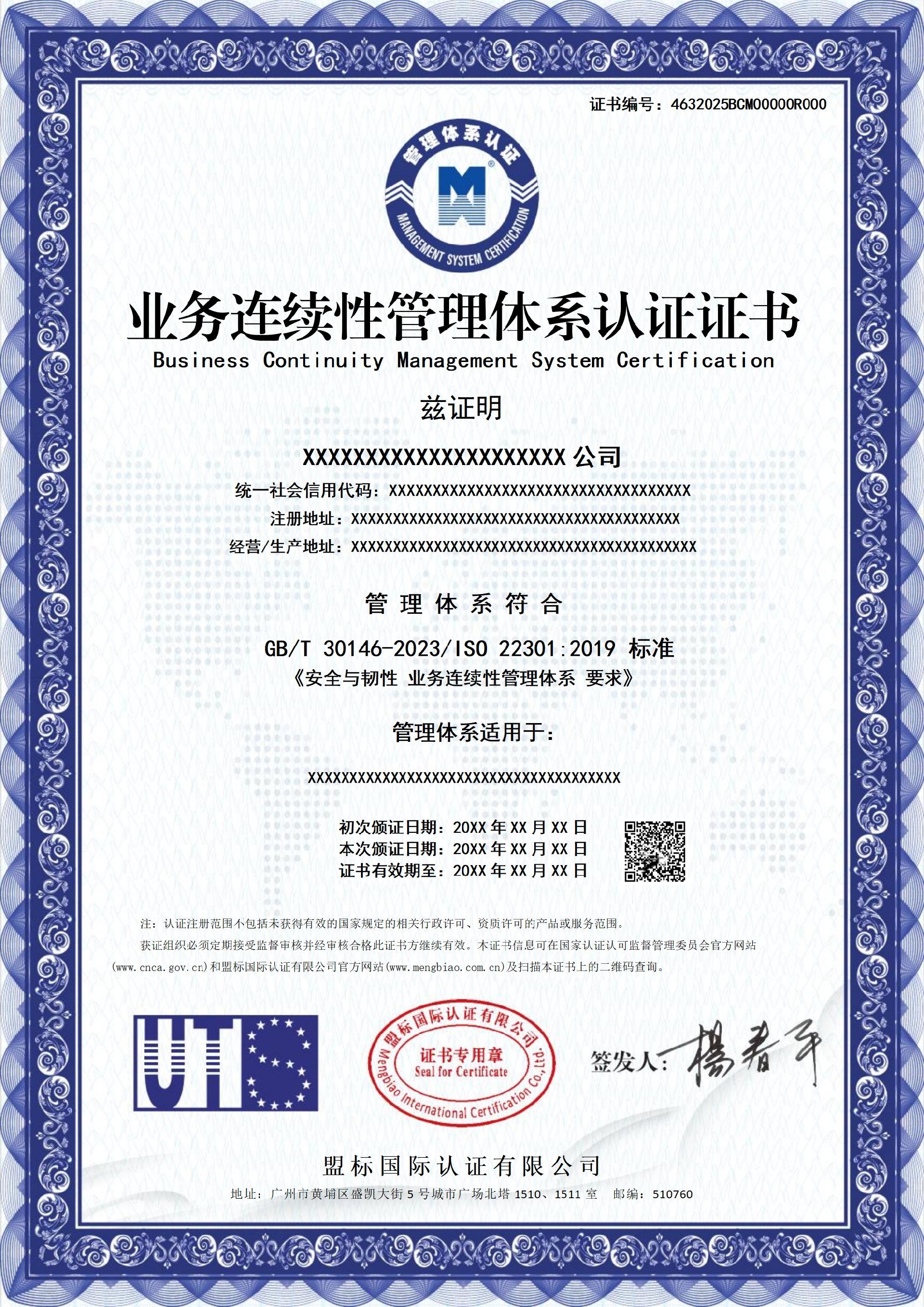 业务连续性管理体系认证证书-中文版