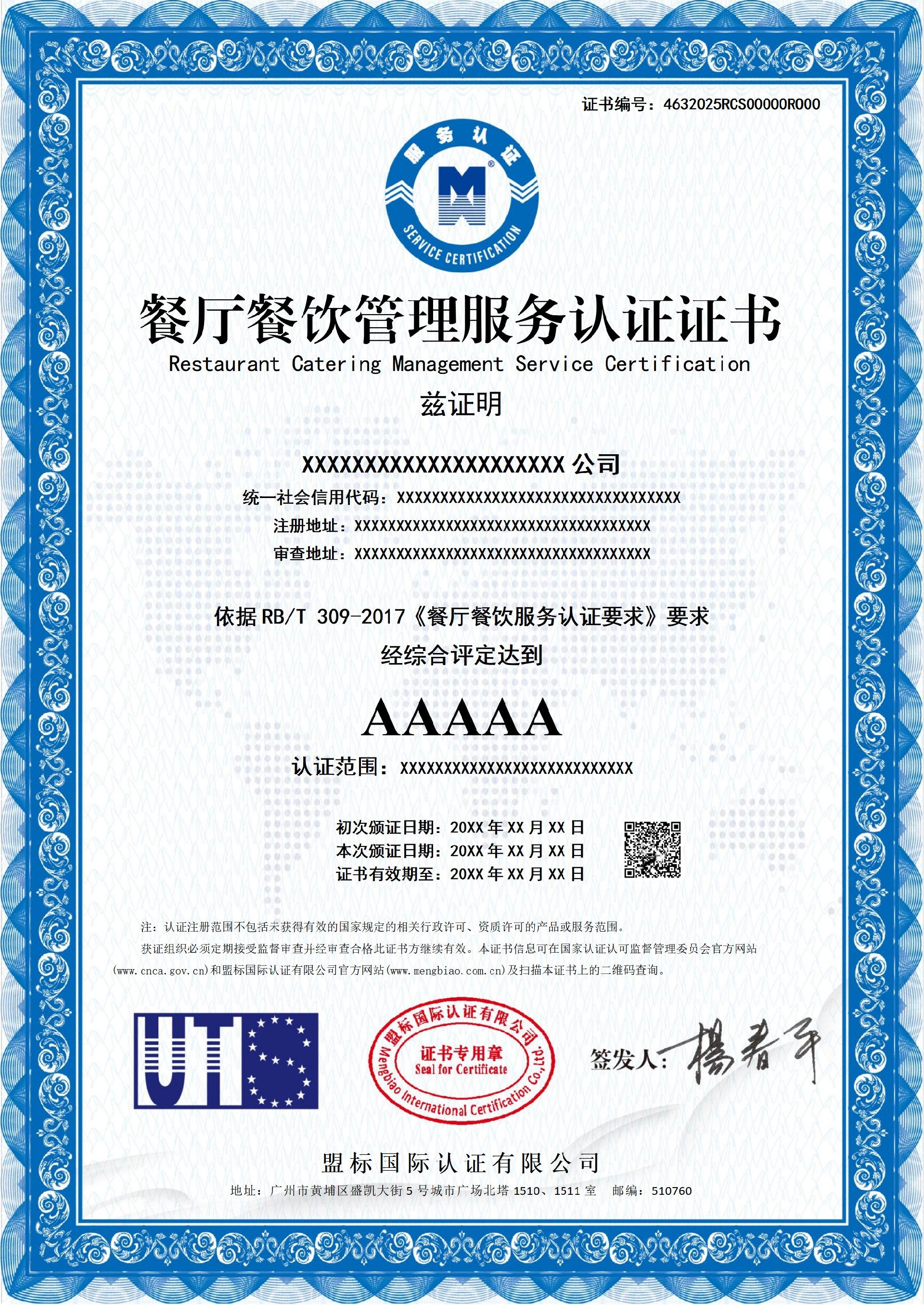 餐厅餐饮管理服务认证证书(RCS)-样版