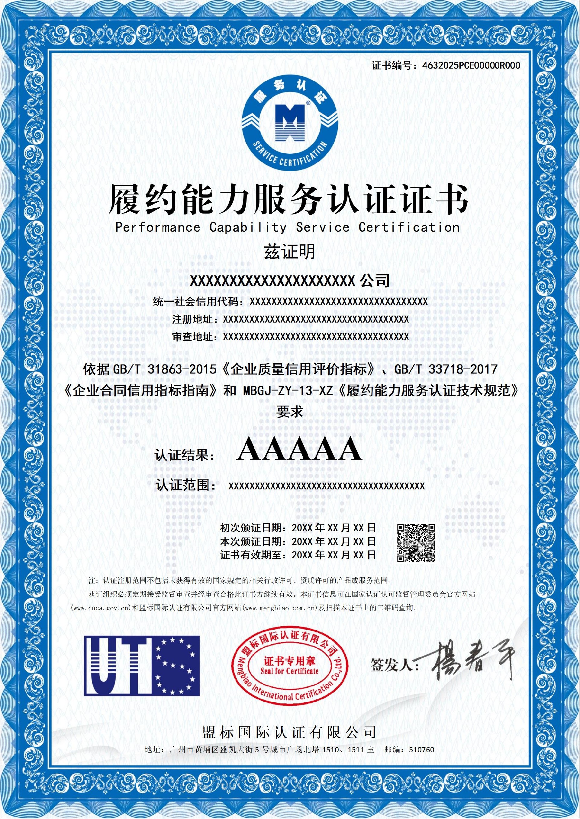 履约能力服务认证证书-样版